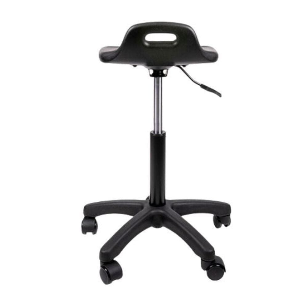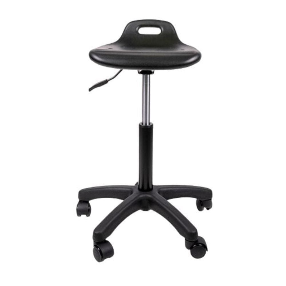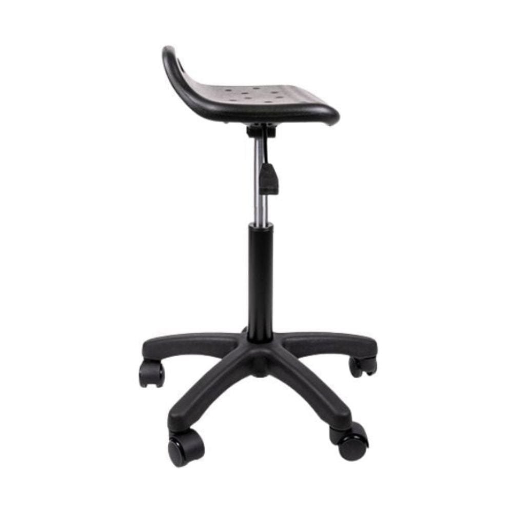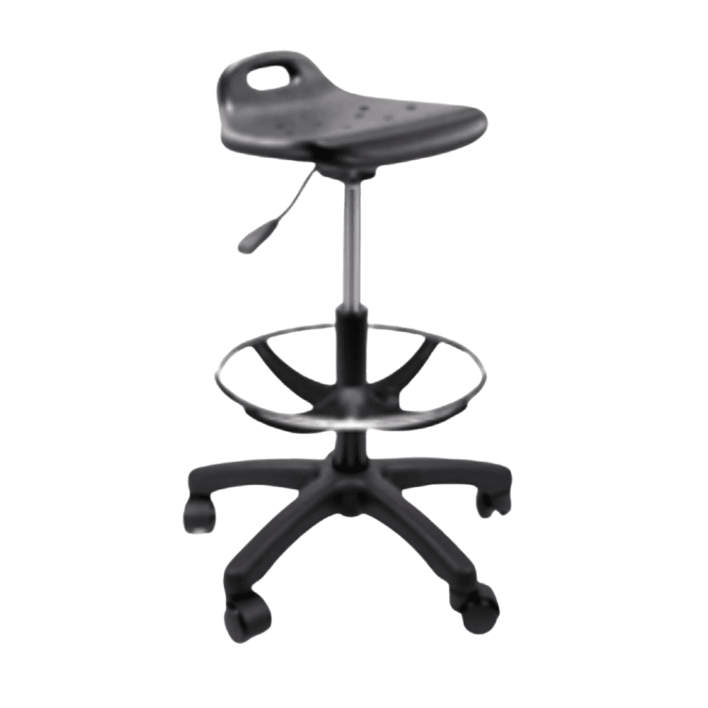 Su asiento en poliuretano compacto suave de uso industrial con interior de madera de aglomerado y curvatura antropométrica garantiza comodidad incluso en jornadas largas, mientras que su estructura permite soportar hasta 140 kg. El pistón neumático tipo cajero facilita el ajuste de altura al instante, y el mecanismo de plato de acero reforzado con palanca de accionamiento y bloqueo asegura la posición deseada.